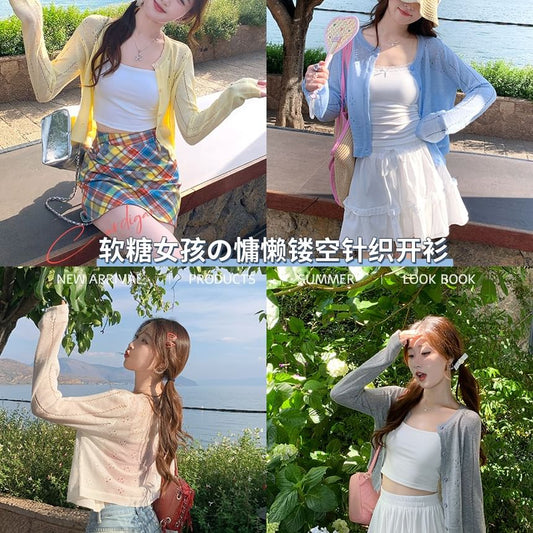 Cardigan Perforated Button-Up Plain Crop Crew Neck