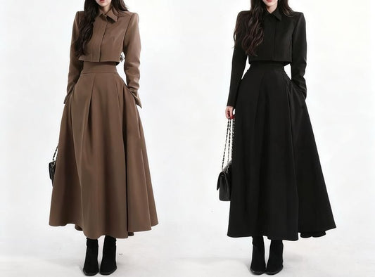 Set: Long-Sleeve Plain Crop Shirt + High Waist Midi A-Line Skirt