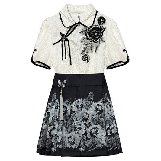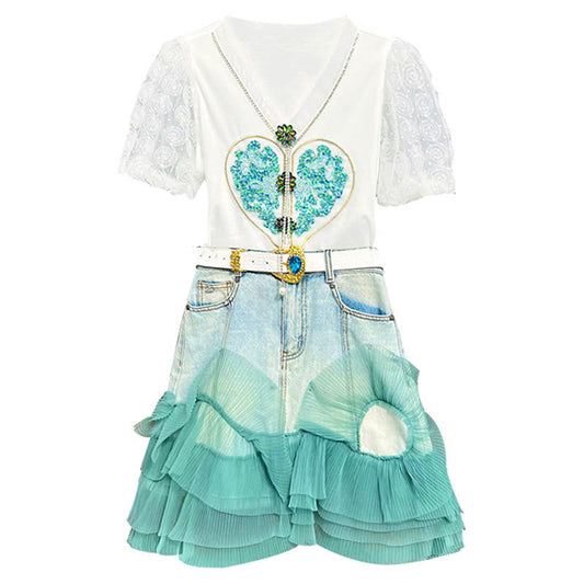 Flower Decor Shirt Embroidery Mesh Skirt Set