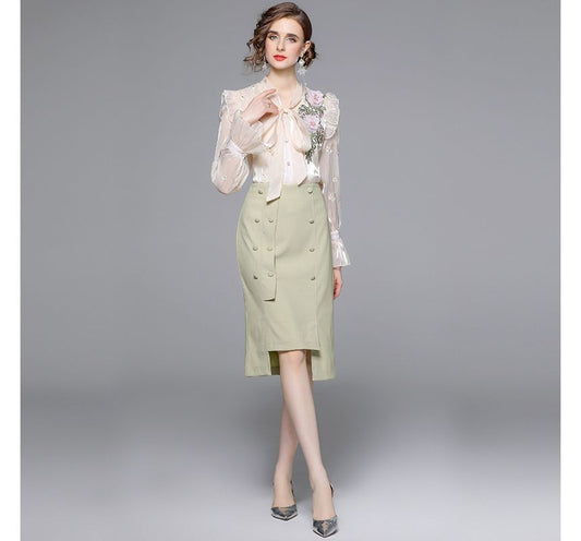 Set: Bow-Neck Ruffle Trim Embroidered Blouse + Plain Midi Pencil Skirt EE10