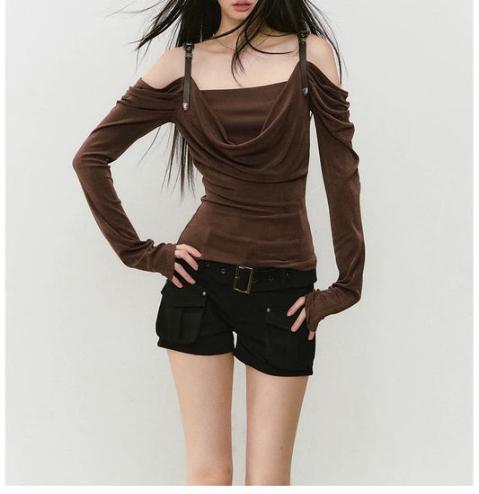 Long-Sleeve Off Shoulder Plain Ruched T-Shirt