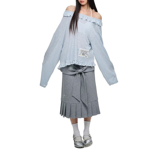 Off-Shoulder Striped Sweater / High Rise Plain Wide Leg Pants