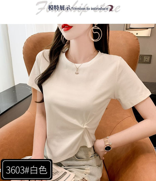 Plain Asymmetrical Crew T-Shirt Neck Ruched Short-Sleeve