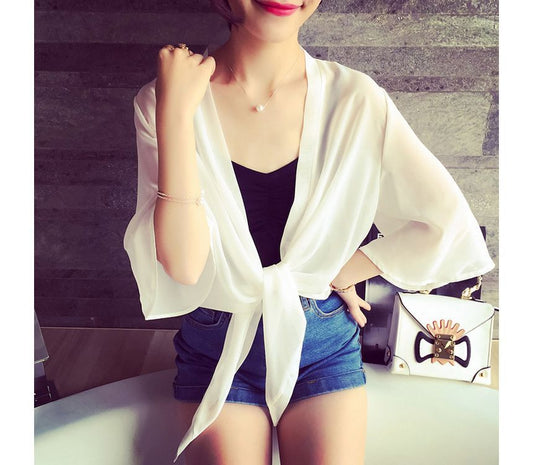 Jacket Front Crop Elbow-Sleeve Tie Chiffon Plain