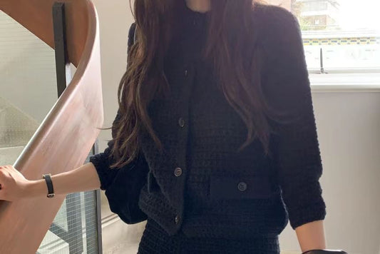 Set: Crew Neck Plain Knitted Button Cardigan + High Waist Plain Shorts