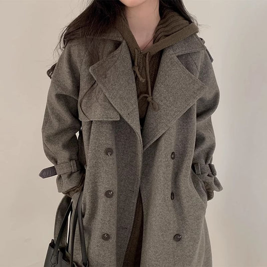 Plain Tie Waist Midi Double-Breasted Coat