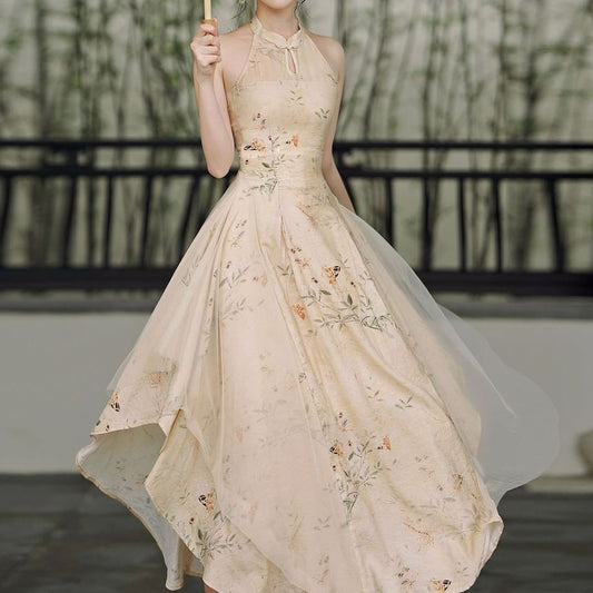 Sleeveless Floral Print Maxi A-Line Qipao / Light Jacket / Set