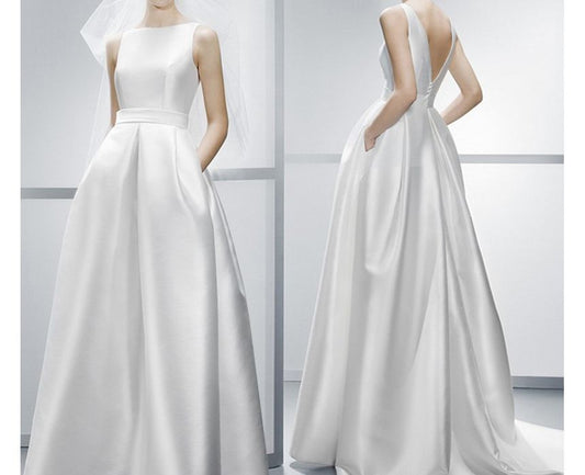 Sleeveless Boat Neck Plain Satin A-Line Wedding Gown