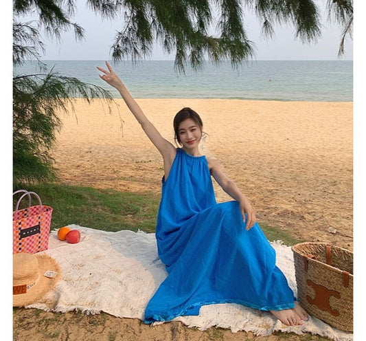 Spaghetti Strap Plain Open Back Shirred Midi Sundress