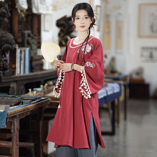 3/4-Sleeve Round Neck Embroidered Hanfu Top / Wide Leg Pants / Set