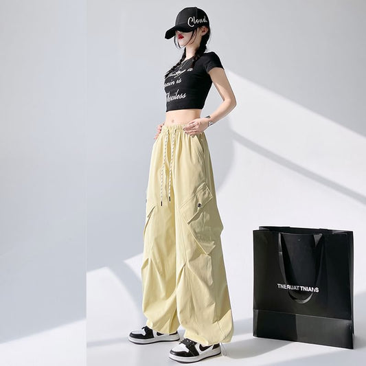 Plain Cargo Wide Waist Leg Pants Drawstring