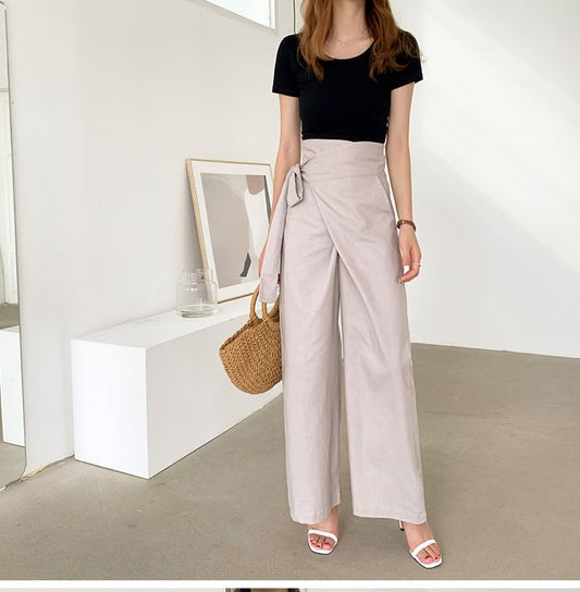 High Rise Plain Tie-Up Wide Leg Pants