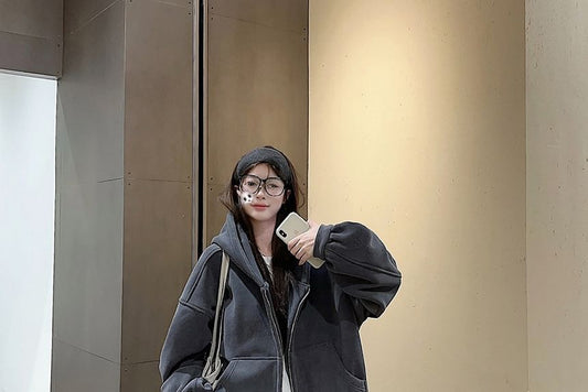 Plain Fleece-Lined Zip Hoodie / Drawstring Waist Wide Leg Sweatpants