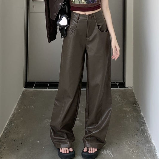 High Rise Plain Pocket Straight-Fit Wide-Leg Pants