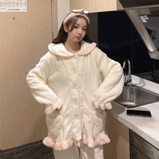 Pajama Set: Bear Embroidered Coral Fleece Button-Up Top + Pants