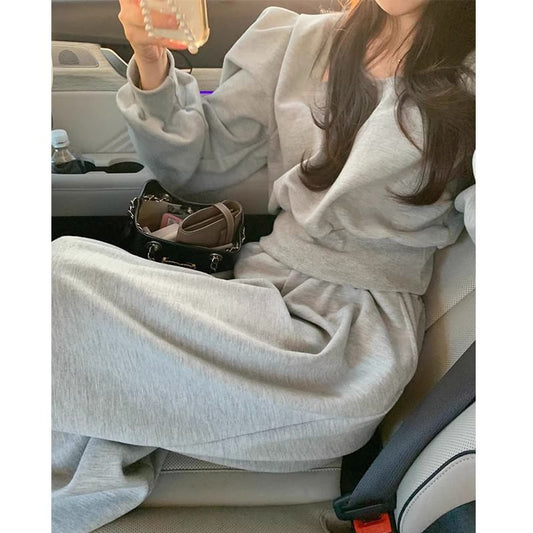 Set: Square Neck Plain Crop Sweatshirt + Elastic Waist Plain Wide Leg Sweatpants