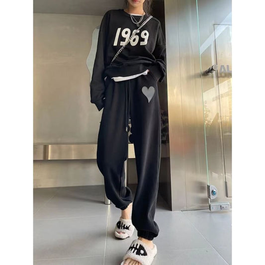 Set: Long Sleeve Plain Loose-Fit Hoodie + Straight-Leg Sweatpants