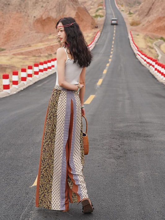 High Waist Patterned Print Slit Tie-Up Wide Leg Pants