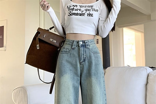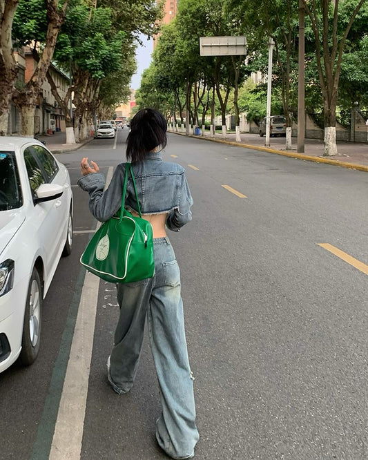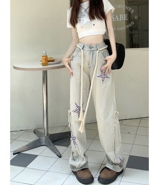 Collar Asymmetrical Fringed Washed Denim Crop Jacket / Mid Rise Distressed Wide Leg Jeans / Set