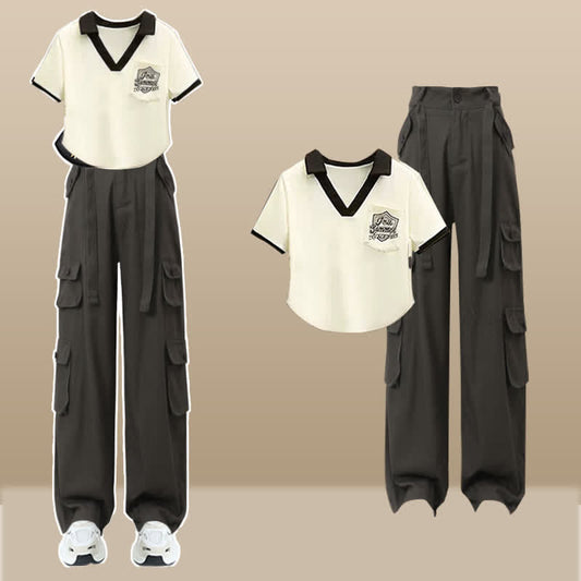 Lapel Embroidery Crop Top T-Shirt Casual Pants Set