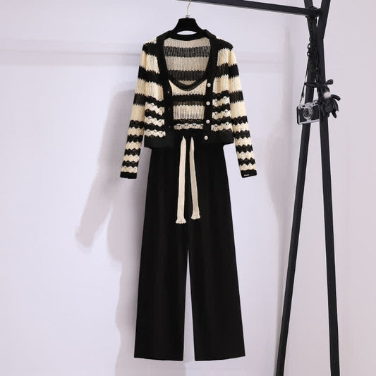 Black Stripe Print Tank Top Cardigan Causal Pants