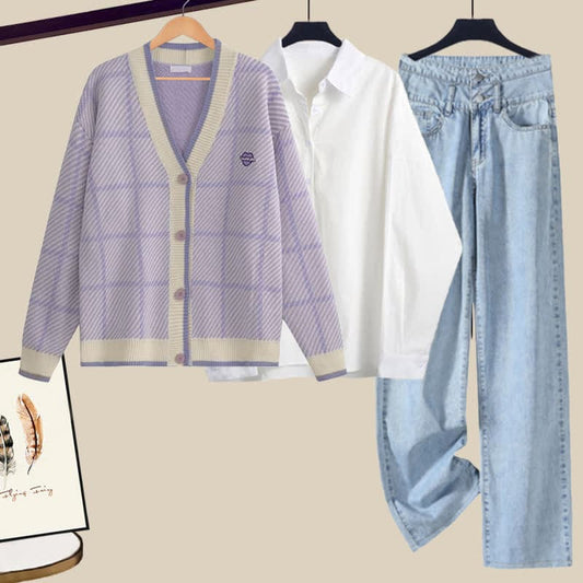 Purple Plaid Cardigan Lapel Shirt Denim Pants Set