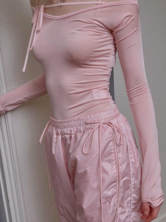 Pink Slim Long Sleeve Top Black Lace Up Cargo Pants Y2k - Kimi