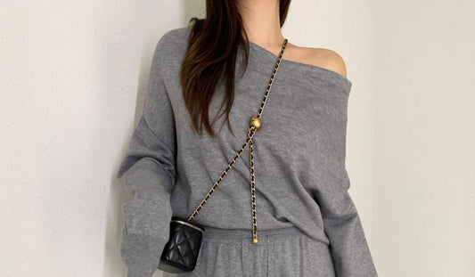Set: Long Sleeve One Shoulder Plain Knit Top + Drawstring Waist Wide Leg Pants