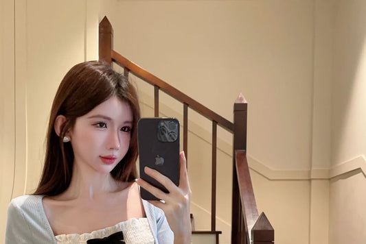 Long-Sleeve Crew Neck Plain Ruffle Trim Cutout Back Tie Front Blouse / High Waist Maxi A-Line Skirt
