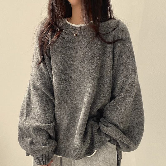 Balloon Sleeve Turtleneck Plain Slit Oversized Sweater