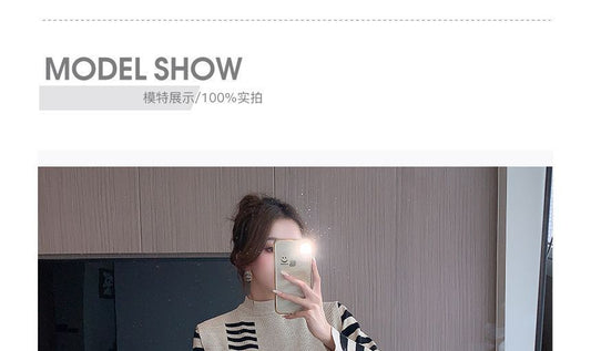Set: Long-Sleeve High Neck Striped Mini Knit Dress + High Neck Paneled Sweater Vest