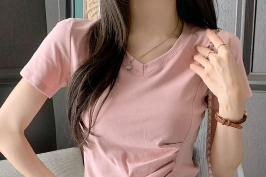 T-Shirt Ruched Short-Sleeve V-Neck Plain