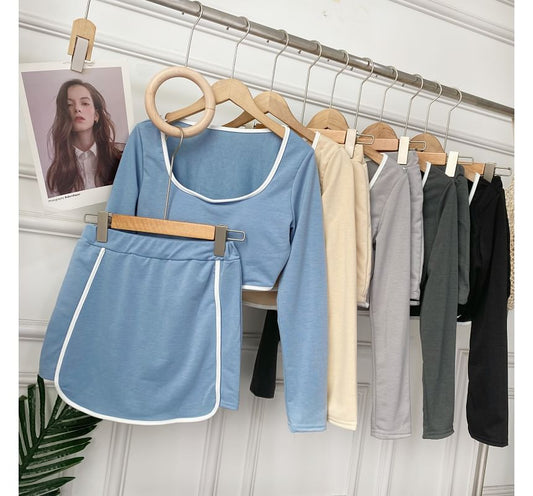 Set: Long-Sleeve Scoop Neck Contrast Trim Crop T-Shirt + High Waist Mini A-Line Skirt