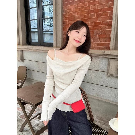 Mock Two-Piece Long-Sleeve Cold Shoulder Plain Knit Top