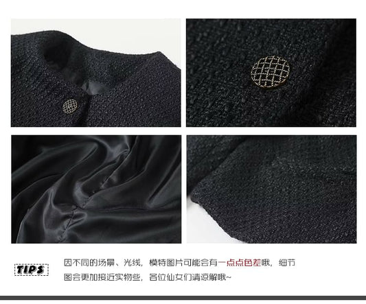 Long-Sleeve High Neck Plain Mini A-Line Layered Dress / Tweed Button-Up Jacket