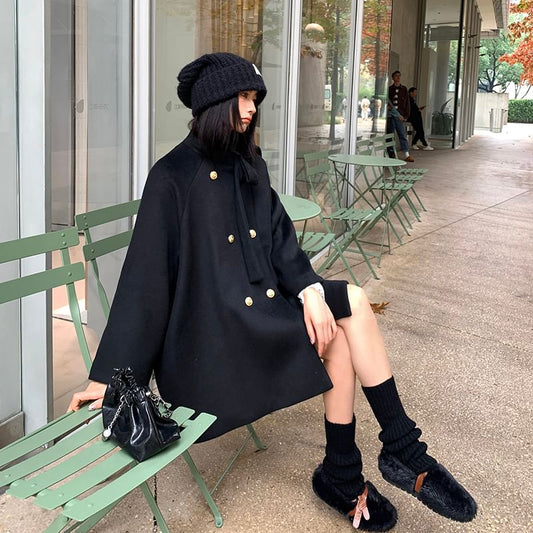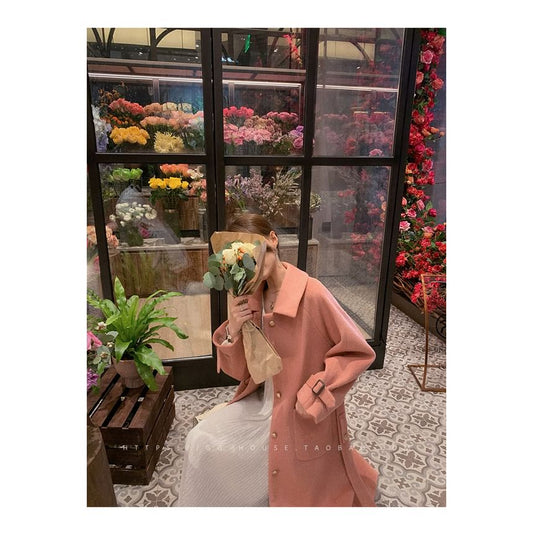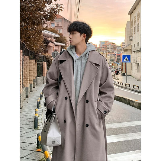 Lapel Collar Plain Double Breasted Wool Long Coat