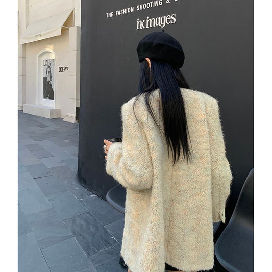 Round Neck Plain Tweed Single Breasted Cropped Jacket