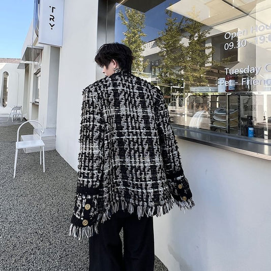 Contrast Collar Plaid Fringed Tweed Button Jacket