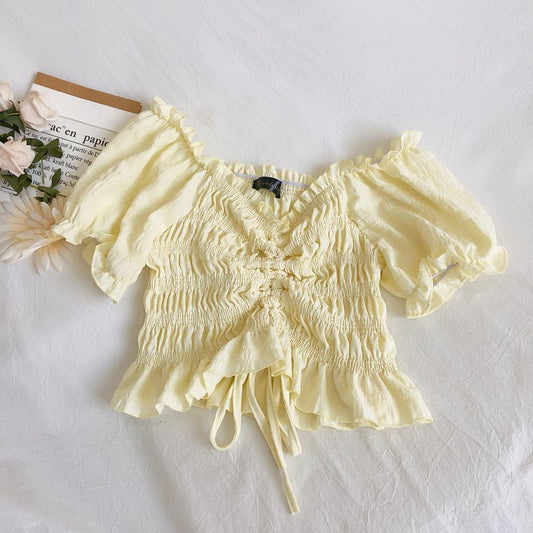 Puff-Sleeve Floral Print Ruffled Drawstring Blouse