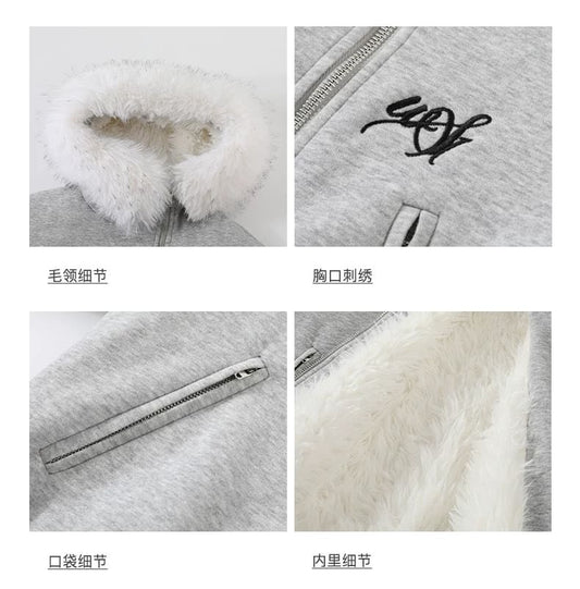 Lettering Embroidered Fluffy Trim Hood Zip Cardigan