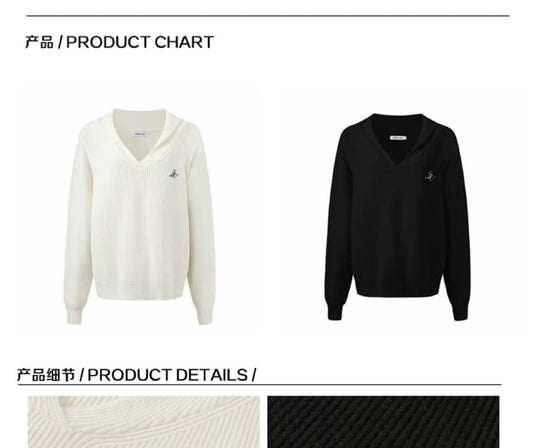 V-Neck Embroidered Ribbed Sweater / Drawstring Waist Plain Bootcut Pants / Striped Scarf