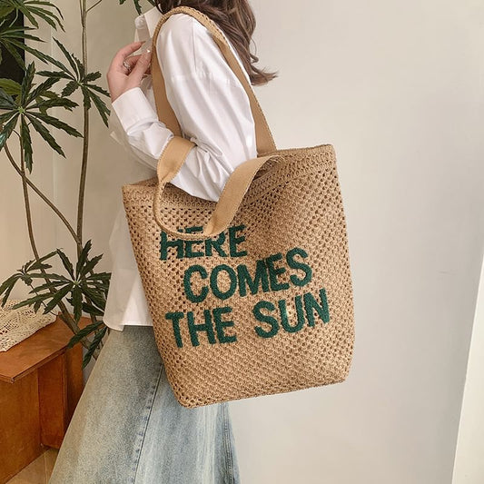 Letter Embroidered Woven Tote Bag