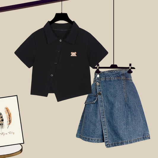 Bear Black Crop Top Polo T-Shirt Denim Shorts