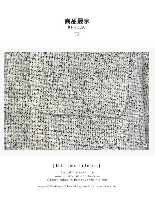 Round Neck Plaid Tweed Button Jacket / High Waist Plain Velvet Mini A-Line Skirt / Set