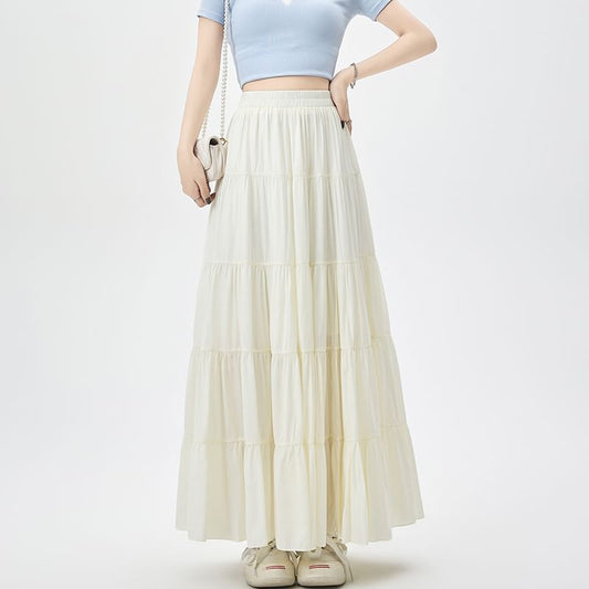 Waist A-Line High Ruffle Skirt Slit Trim Midi Plain