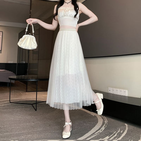 A-Line Skirt Midi Accordion Plain High Pleated Mesh Waist