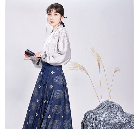 V-Neck Floral Blouse / Mid Rise Hanfu Patterned Maxi A-Line Skirt