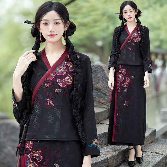 Traditional Chinese Embroidered Open Front Cape / High Waist Maxi A-Line Skirt / Long-Sleeve Blouse / Set