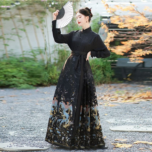 Traditional Chinese Long-Sleeve Print Shirt / High Waist Pleated Skirt