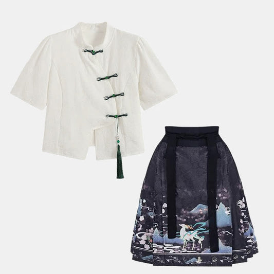Vintage Bamboo Print Tassels T-Shirt Pleated Skirt